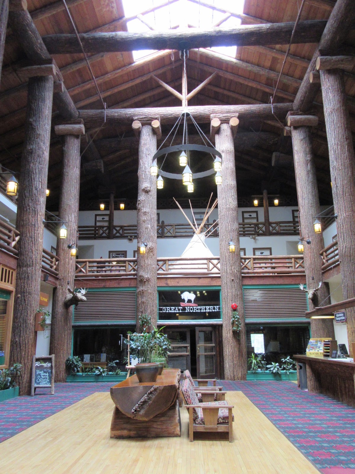 On the way out we stopped in East Glacier to see historic Glacier Park Lodge. This lodge was built in 1912 by the Great Northern Railroad (GNR) company. GNR financed the building of many hotels and lodges in Glacier Park as part of their "See America First" campaign. East Coast and Midwest travelers were invited to hop on the train and come visit the west, assuring that fine lodging, dining, and travel would be available.